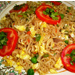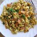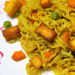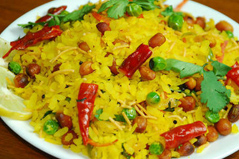 Poha prepared with slightly crunchy peas, other vegetables and soft flattened rice (poha).